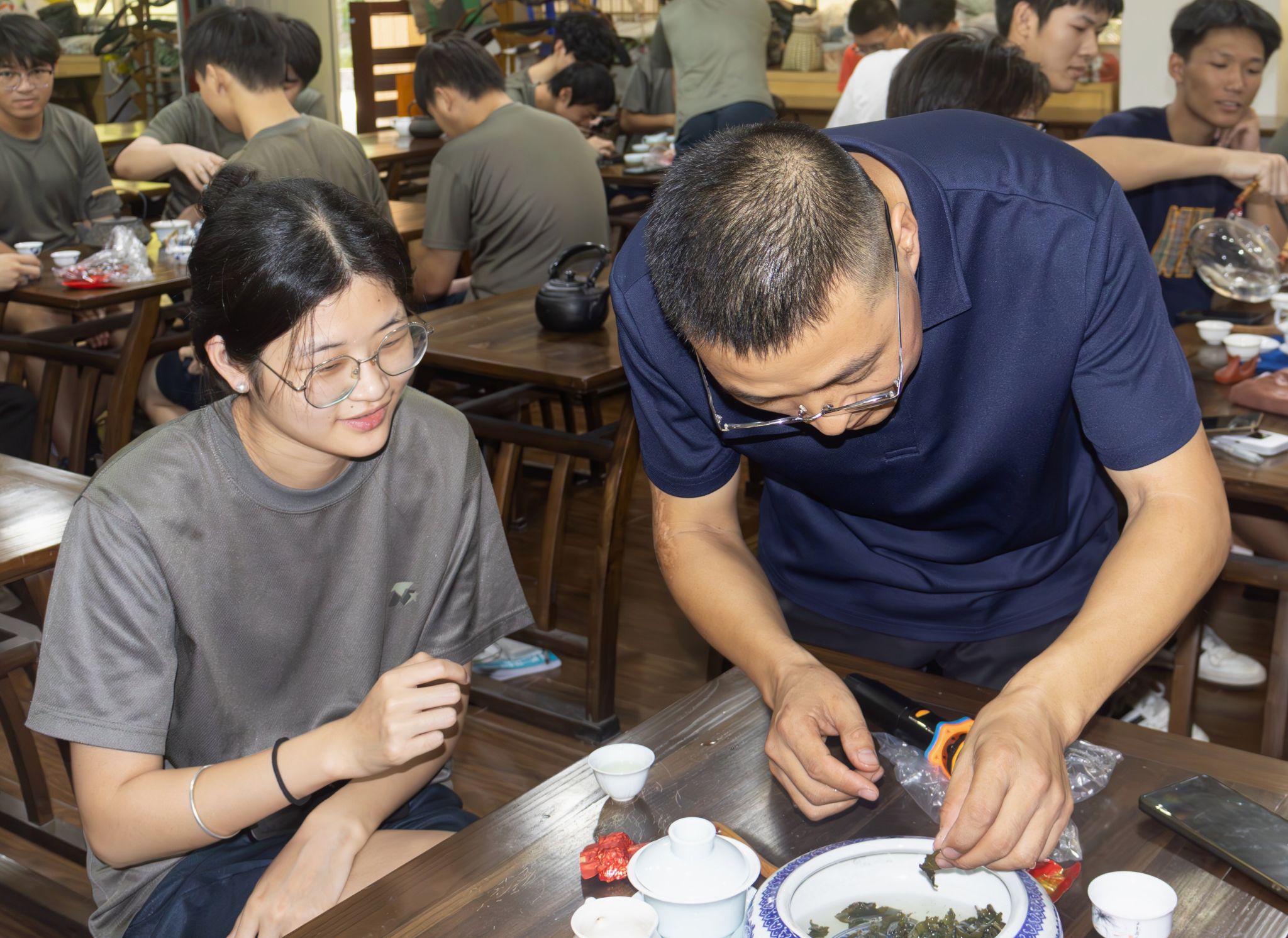 进入体验环节,王宝峰引导同学们亲手操作泡茶流程。他通过展示茶叶泡开后的形状,教大家辨别不同茶类;期间有同学主动提问“喝什么茶补”,现场互动氛围热烈。同学们在亲手泡茶、细细品茶的过程中,不仅进一步加深对茶文化的理解,也让整场分享更具参与感。
